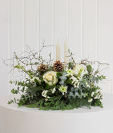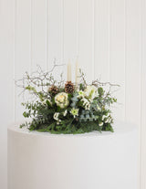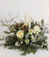 Complete with lush seasonal Christmas foliage, white flowers, gold accents, and candles, this Christmas centrepiece will definitely add to the festivities of the day!.