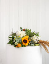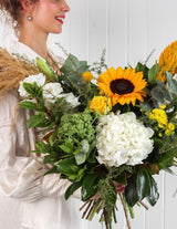 A seasonal textural bouquet of yellows, greens, whites, and foliage, hand-picked by our talented florist. Our "sunshine" bouquet, perfect for brightening one's day, expressing a thank you or your condolences.