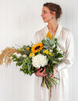 All bouquets are packed with water to keep flowers fresh. We wrap our bouquets in white paper finished off with our signature dandelion piece. Alternatively, add on a signature flower box to your order.