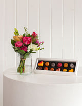 Our signature Petite arrangement, complete with a glass jar, bundled together with your choice of a box of 6 or 12 handmade bonbon chocolates.